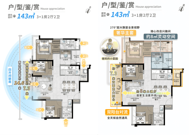 项目为精装实景现房,所见即所得,交付有保障,省去期房等待烦恼。户型涵盖98-143㎡全周期产品,全南向设计,部分户型带270°转角飘窗,得房率达90%,空间利用率突出,适配多元家庭需求。