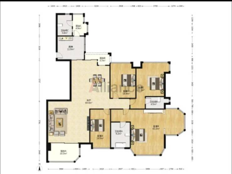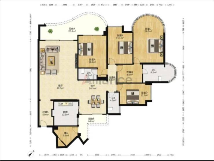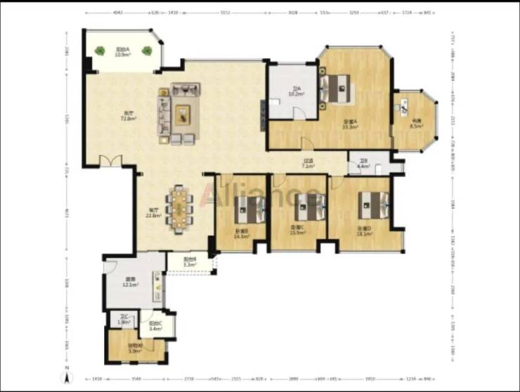 200平以上的大户型主要分布在鸣泉轩组团和克莱公寓组团。