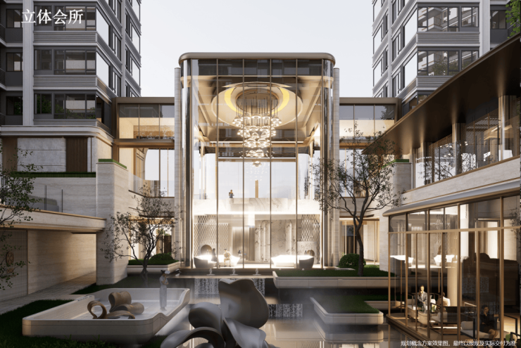 :引领现代奢居美学范式,打造下沉式立体会所,覆盖娱乐、健身、儿童、交流等多种功能,形成功能交叠的会所聚落,室内外景观功能相互渗透,为业主提供高品质的休闲社交空间。