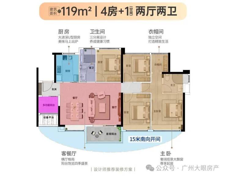 【119㎡4+1房2厅2卫】单边位布局,15米南向开间,南北通透