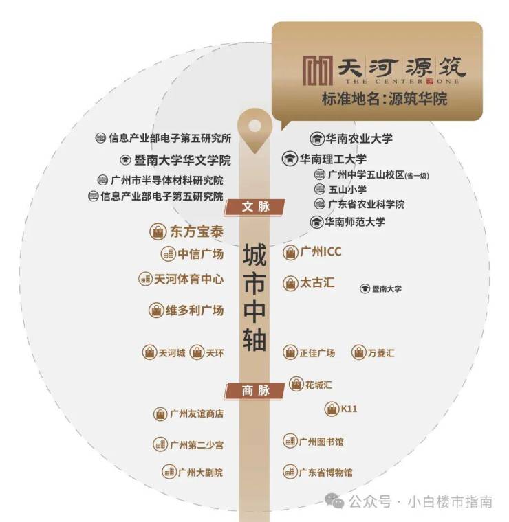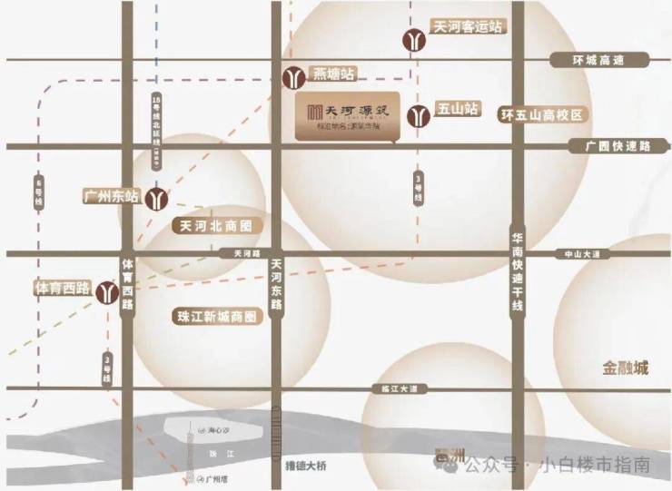 项目位于后天河北东莞庄,距离体育中心5公里,这里距离珠江新城、金融城都是在7公里范围内。处在华南理工大学旁,周边还有华师、华农、暨大等高校,教育气息非常浓厚
