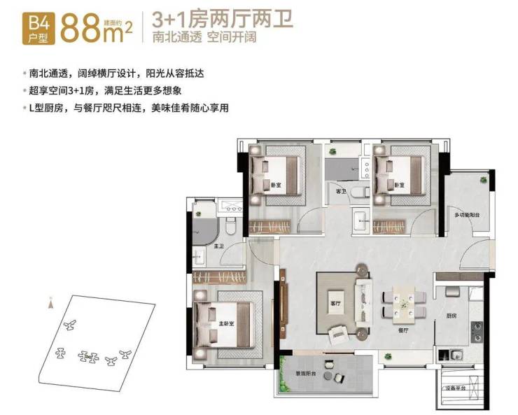 【88㎡3+1房2厅2卫】阔绰横厅格局,南北通透