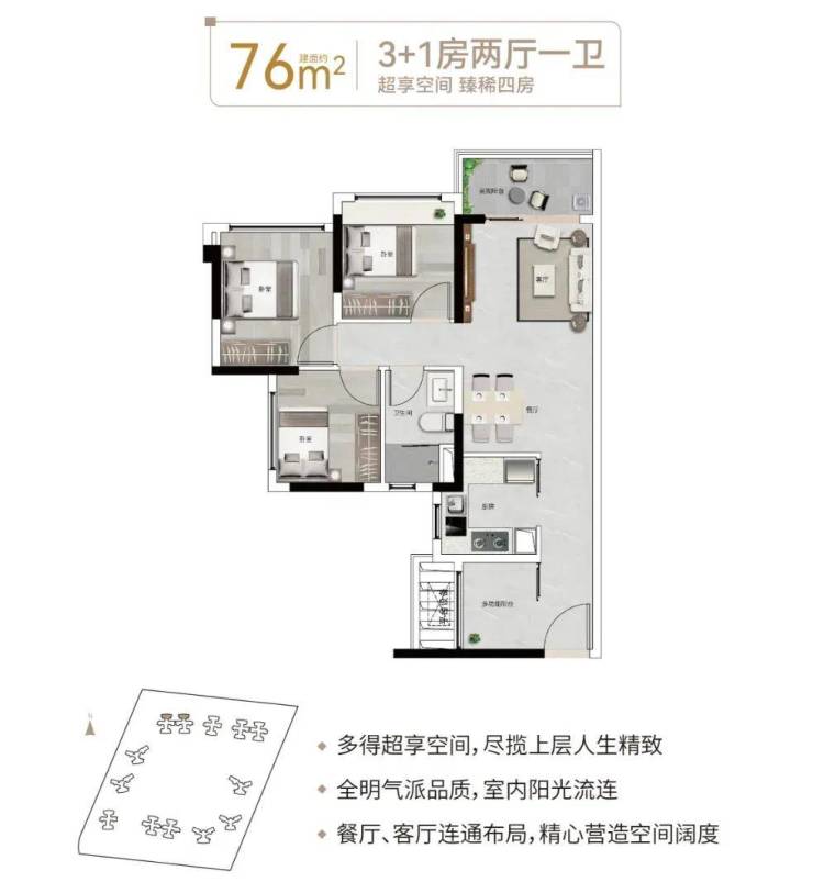 【76㎡3+1房2厅1卫】餐厅、客厅连通布局,低总价晋阶天河