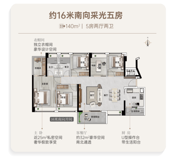 五房设计让多胎家庭每个孩子都有独立空间,约25㎡主卧套房让家长与孩子互不干扰。