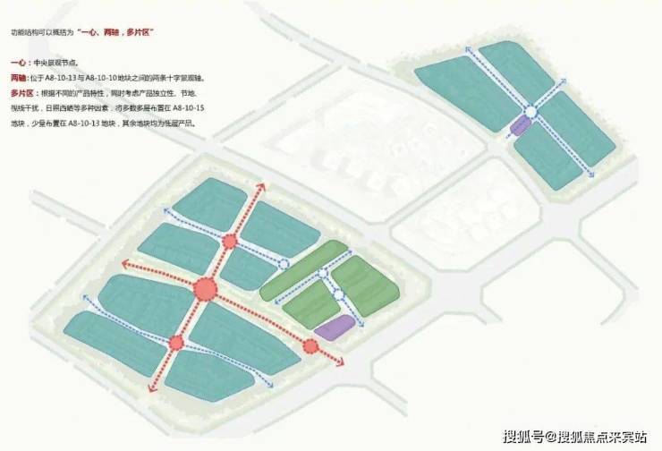 地块之间相对独立,如何通过规划加强不同地块之间的联系是我们进一步整体规划的起点。一心、两轴的主轴构架将各用地单元有序衔接,形成聚落式组团结构,综合考虑产品独立性、景观节点、视线干扰、日照西晒、容积率等多种因素,将大部分多层布置在“15地块”,其余均设置二层别墅。