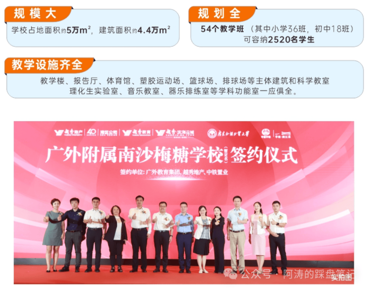 中铁置业(广州)有限公司携手广外教育集团共建广东外语外贸大学附属南沙学校,其距离中铁·阅江来仅约500米,是一所54班九年制公办学校,预计今年9月开学(具体招生范围与学校信息以教育局发布为准)。