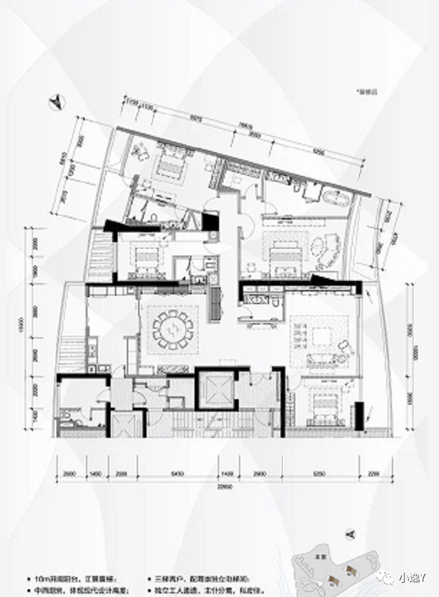 以天誉半岛建面约440方三江天境为例,三江天境室内采用LOW-E玻璃落地巨幕,270°领略三江的壮阔尺度;约9米面宽的超大空间,是客厅,亦是仪态端庄的家族朋友聚会场所;