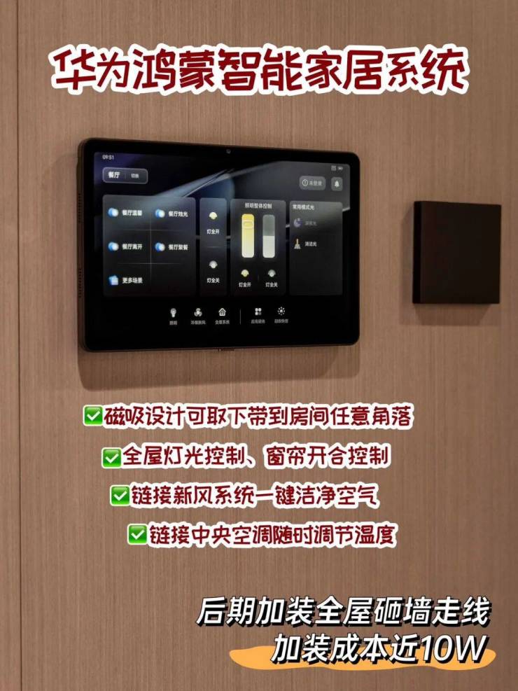 华为鸿蒙智能系统,琶洲TOD同款,中控屏可控制全屋灯光,窗帘,也可联动新风系统实时检测屋内空气质量和温度,且有燃气智能警报;