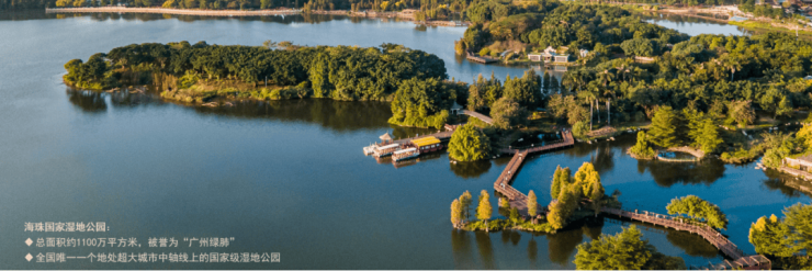 项目南瞰超万亩海珠国家湿地公园,全球超大城央湿地,约1100万㎡城央绿洲,距离项目约300米,可通过地下地铁连廊无风雨、无温差步行约5分钟可达。
