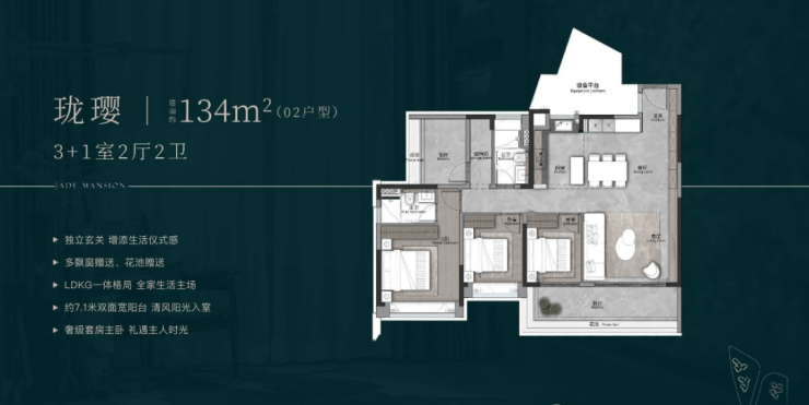 建面约134㎡,大开间奢阔大厅,南向四面宽,约7.1米宽 奢阔LDKG大方厅