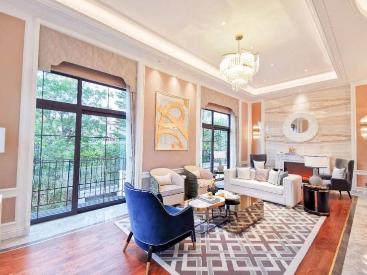 轻奢软饰增强空间呼吸性,深邃格调提升艺术气息。艺术吊灯、典雅陈设、清新原木、奢华石材,深浅呼应的软硬搭配,以爱马仕为主加深蓝点缀,简雅大气而不显沉重。