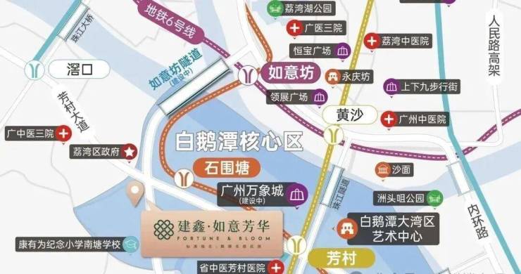 广州建鑫·如意芳华(别名:桥梓大街南侧地块项目、鹅潭名郡花园)位于荔湾白鹅潭CBD,由国企广东建工集团开发。项目距地铁11号线石围塘站约600米,交通便捷。小区采用围合式布局,有1.8万㎡园林,户型为88-138㎡三至四房,得房率高,部分户型可望江,配套设施完善。