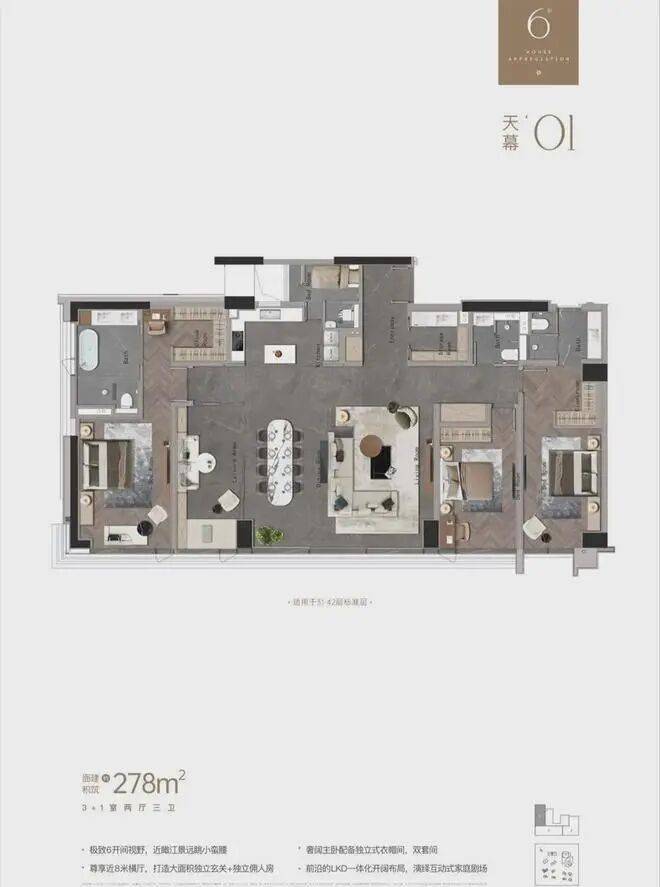 6栋望江公寓,总高43层,15、30楼是避难层,24年6月交,中区(16~29层:206、232、261㎡,5梯4户);低区(3~14层:98、146、143、151、161 ㎡,3梯7户,在售10、11楼)