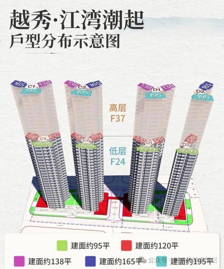 项目共规划4栋住宅楼,均为37层,分高低区设计,而且梯户比跟户型都各不相同: