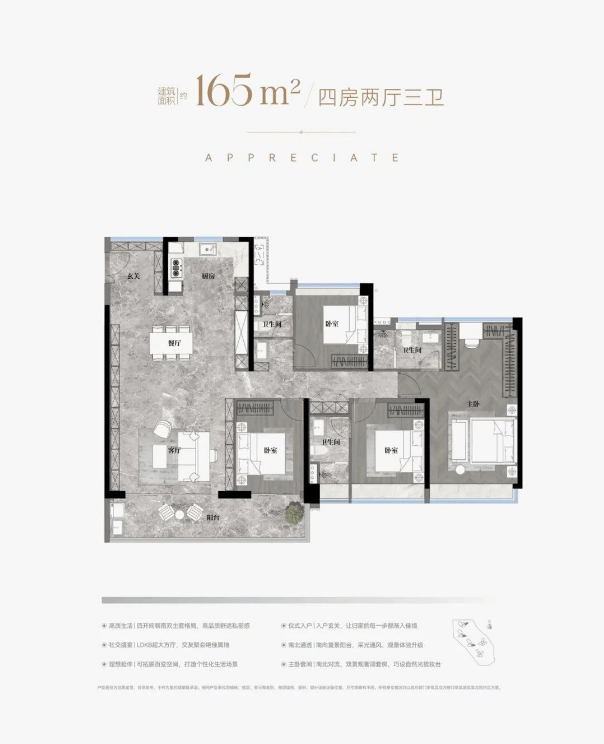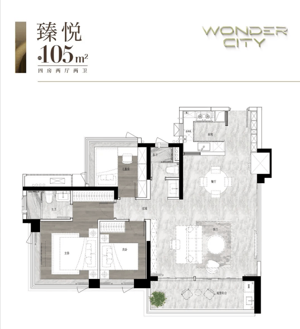 以建面约105㎡明星户型为例:LDKB一体化宽厅开间可达约6.1米,主卧配置270°环幕飘窗,四间卧室均可放置1.5米大床,空间尺度媲美市面上建面约130㎡户型。