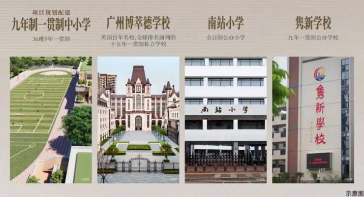 2、教育配套优质,配建9班幼儿园和36班九年一贯制公办学校,引进湖南师范大学附属学校,预计2027年9月开学,填补南站板块教育空白,周边还有广州博萃德国际学校等。