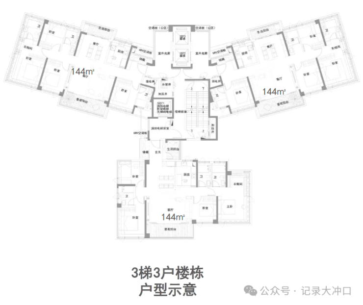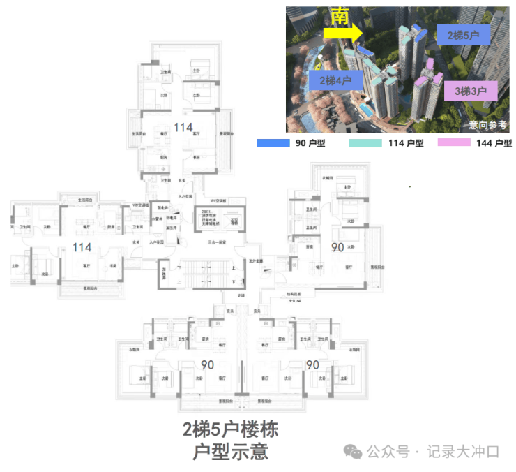 (1)高比例私梯入户:项目约 70%的户型实现了私梯入户或入户花园配置。特别是 144㎡大户型,全部采用3梯3户的专梯专户设计,而 114㎡四房部分户型也实现了私梯入户,未配置专梯的户型则配备了入户花园,极大提升了居住私密性和舒适度。