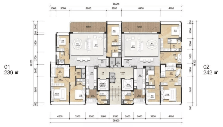 建面约239㎡的户型拥有一个宽度为8米的阳台,而建面约242㎡的户型则拥有一个宽度为8.4米的阳台。这两个户型的实用率为83.6%。