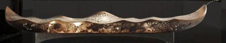 由广东非遗剪纸大师饶宝莲亲手打造的“勇立潮头舟”跃然眼前。整个作品采用铜凿剪纸和金漆木雕结合的工艺,镂空雕刻了羊城八景的纹样。在庭院水景的映衬下,犹如龙舟竞渡,生生不息,寄寓着天曜业主抢占先机,敢为人先的进取精神。