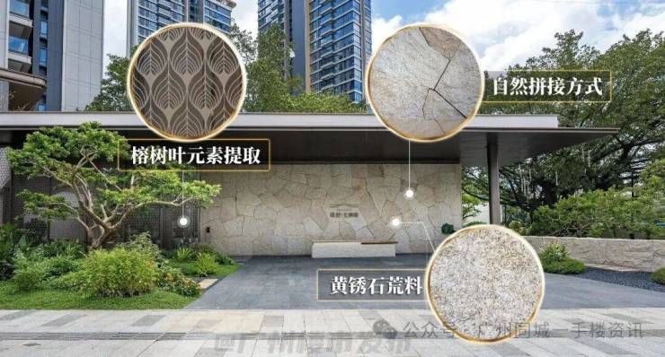 在主入口迎接你的,是一座臂展约38米的奢石门楼,一眼即气势恢宏,而最引人注目的,是一整面黄锈石荒料打造的自然景墙。