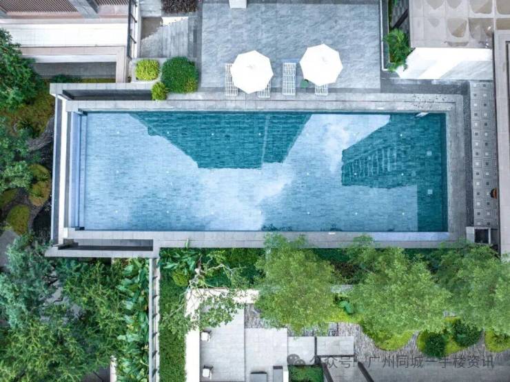 从半空中的泳池对望园林,池底祖母绿奢石的反光,在午后的阳光下更显松弛