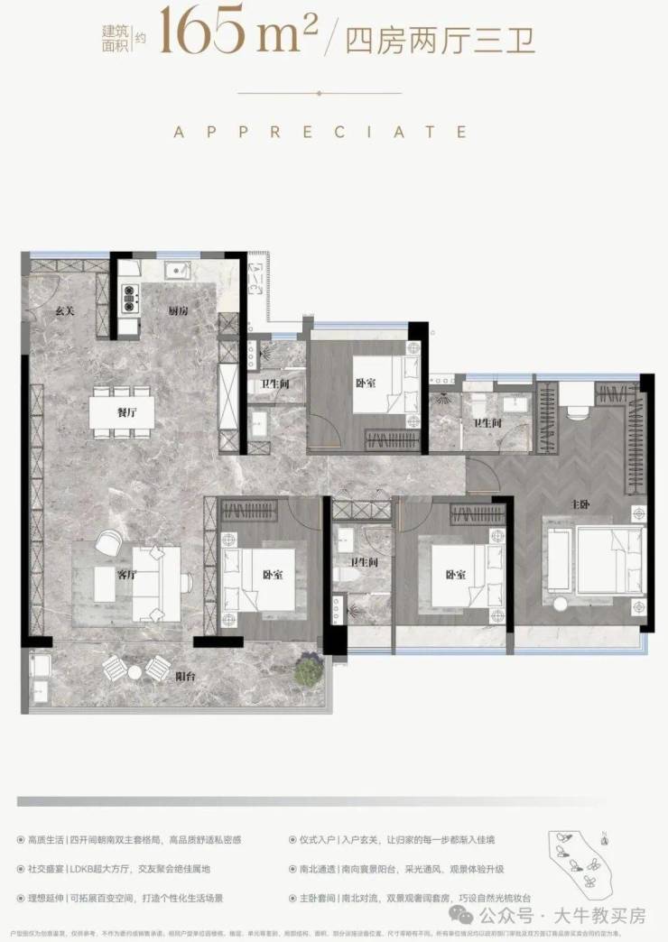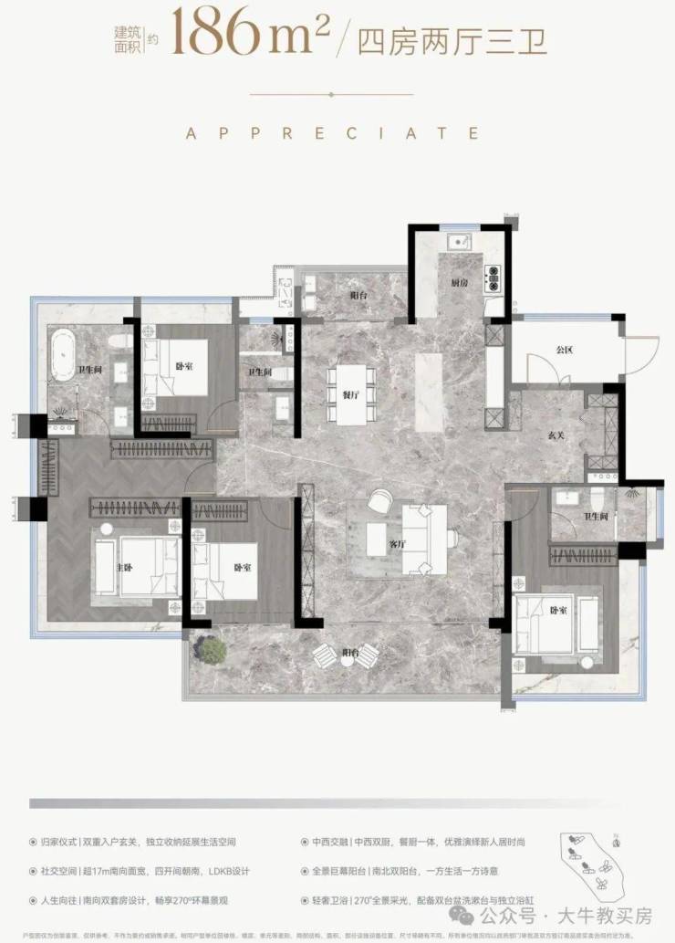 ✅真跃级:约3.75m开间主套,步入式衣帽间+270°景观飘窗+三分离卫浴;