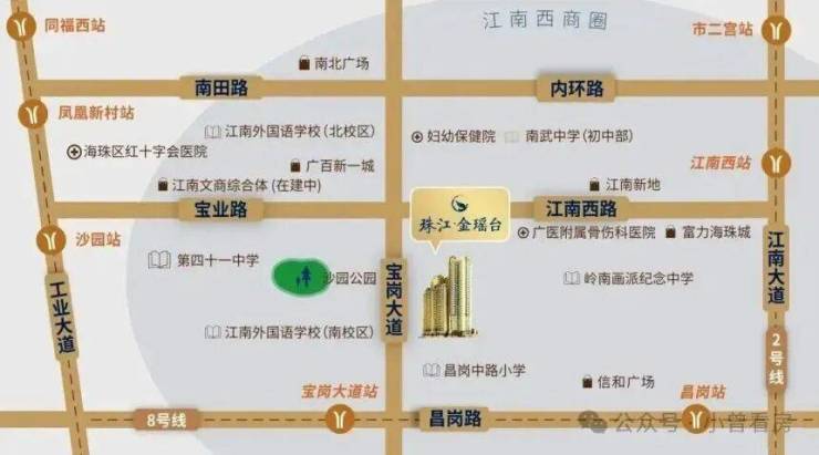 交通出行是这个楼盘的一大优势。距离地铁 8 号线宝岗大道站只有 280 米,步行 5 分钟就能到,坐 1 站到昌岗站还能换乘 2 号线,去广州火车站、海珠广场都很方便;距离 2 号线江南西站也才 800 米,步行 10 分钟左右,通过地铁去琶洲商务区、珠江新城通勤都不算远。