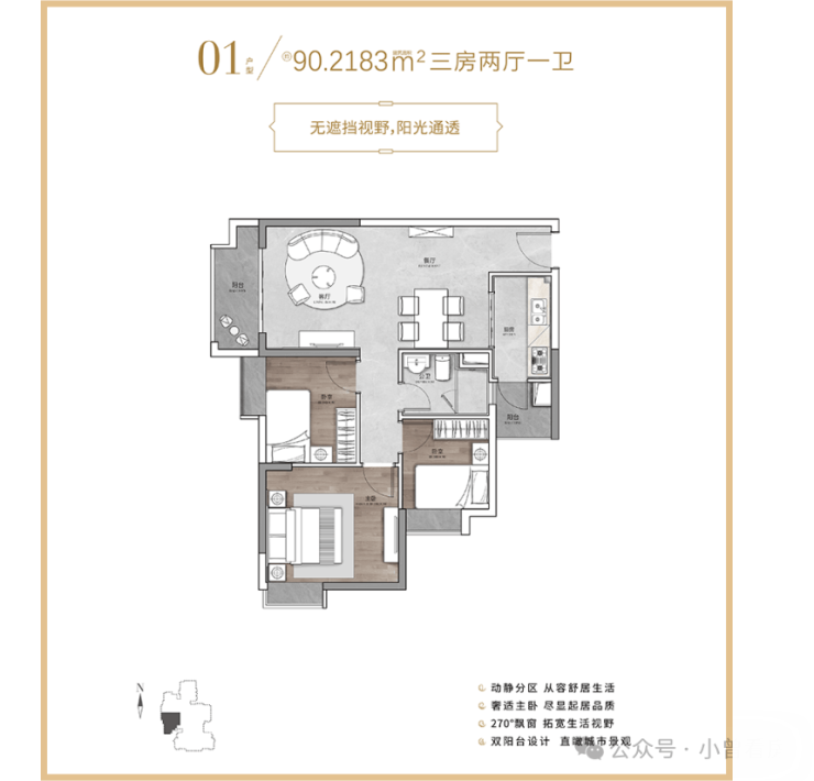79㎡的 2 室 1 厅是刚需热门 ,得房率能到 82%,主卧带 270° 转角飘窗,采光不错,南向的朝向也让房间冬天更暖和,客厅和卧室的空间分配比较均衡,不会显得局促。