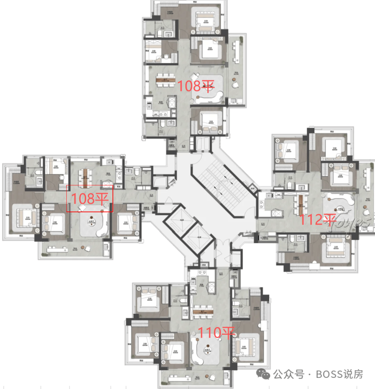 规划了 5 栋全南向住宅和一所小学,洋房仅32层高,采用(T4/T5)舒展楼型设计,对比传统布局,实现了四大优势: