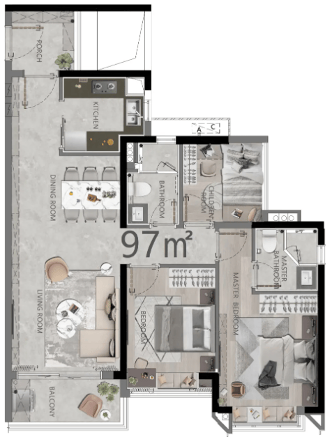 这是项目最受刚需家庭欢迎的户型,总价约360-380万元,单价3.8万/平起,性价比极高。户型设计十分贴心,配备专属入户花园,既能放置鞋子、杂物,又能作为入户缓冲区,提升居住私密性。