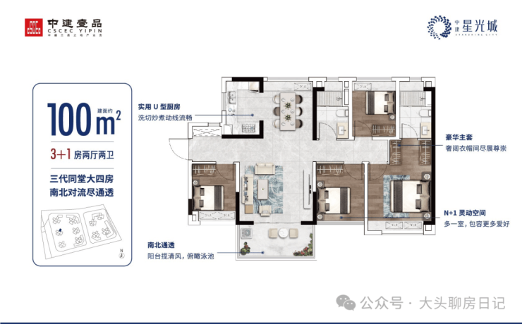 【建面约100㎡ 3+1房2卫】