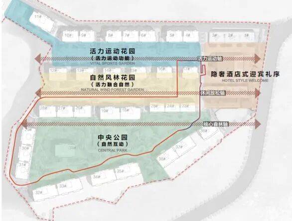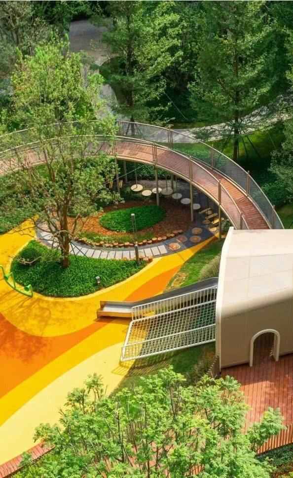 :利用半山地势打造丰富多变的台地园林景观,将半露天连廊贯穿其中,不受天气干扰。设置全龄功能场景,如立体儿童游乐场、空中栈道、半山观景平台等,带来立体式、沉浸式垂直秘境般的园林体验。以一期中央公园为例,丛林探索乐园针对不同阶段孩子设计了相应游乐设施,满足孩子探索和冒险需求。同时,园林内阳光大草坪为业主提供了多种趣味互动空间,可开展搭帐篷、看露天电影等活动。星际云廊的设计让园林纵向生长,形成有趣的洄游动线和观景角度变化,还为业主提供独处空间,且云廊无界串联小区各处,方便业主享受园林。