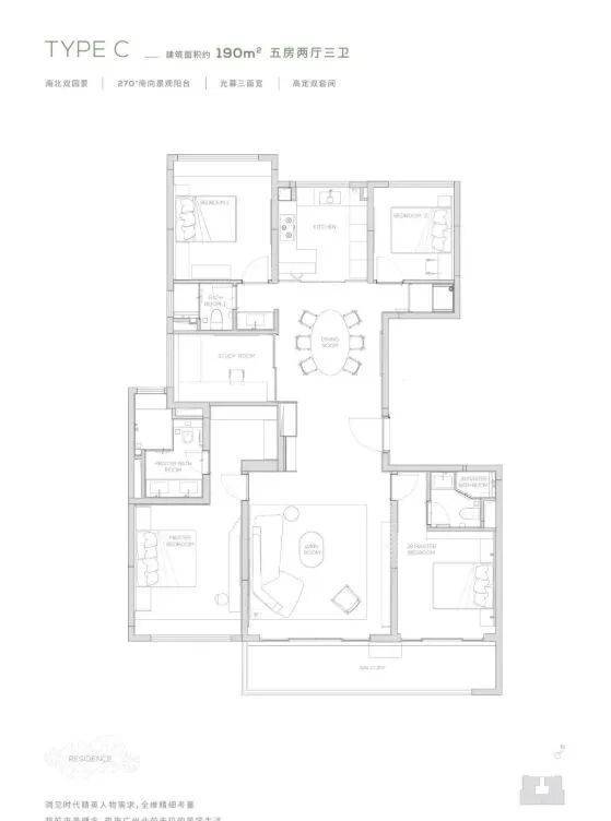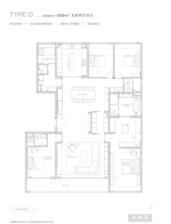 卧室设计注重舒适性,主卧套房配备独立卫生间和衣帽间,空间宽敞,可打造舒适的休息空间。其他三间卧室也能满足家庭不同成员的居住需求,可作为儿童房、老人房或书房等。此外,户型采用【M + 科技系统】,从空气、饮水、环境等核心要素出发,选用优质材料和工艺,为业主提供绿色健康、智慧便捷的居住体验,满足现代高品质生活的需求。
