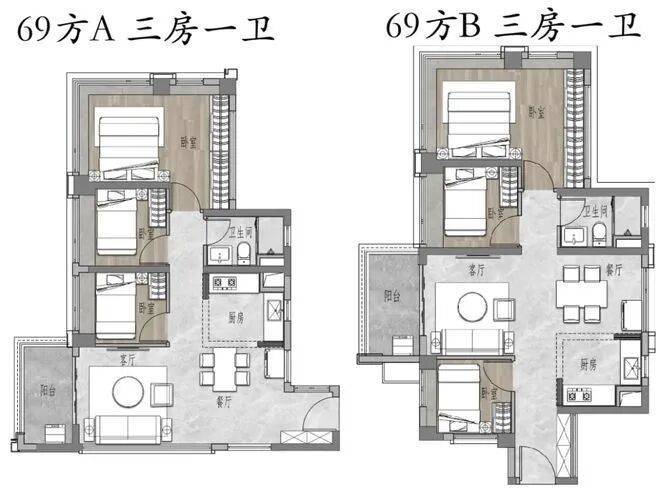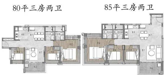 【保利珠江印象】户型为 69-113㎡,69㎡是西部稀缺极小新规三房,可改造成大方厅,主卧约 17㎡;85㎡为南向三房两卫,带独立玄关,四开间朝南;113㎡四房两卫,四开间朝南,南北对流,主卧近 30㎡。新规户型得房率超 100%,空间利用高效,居住体验舒适。