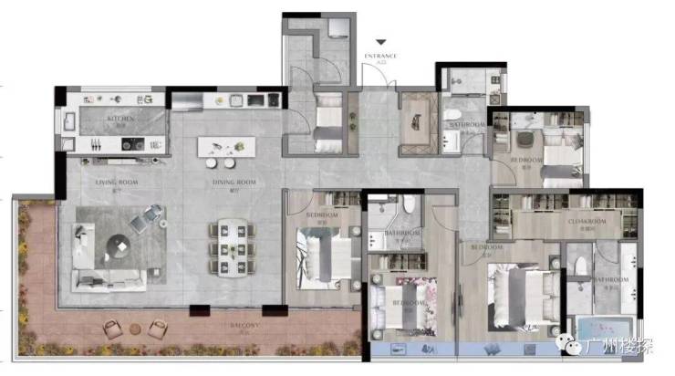 188㎡已经进入到豪宅范畴了,宽敞的客厅、超长的阳台,把珠江的景色引进家里,四开间都是朝江的,景观得到最大利用。