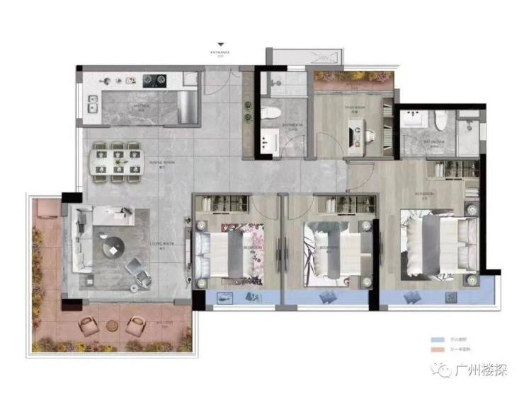 105㎡户型3+1房,U型厨房和大阳台,奥园的户型做得出奇的好,主卧空间也很大,实际居住体验接近120㎡的户型了。