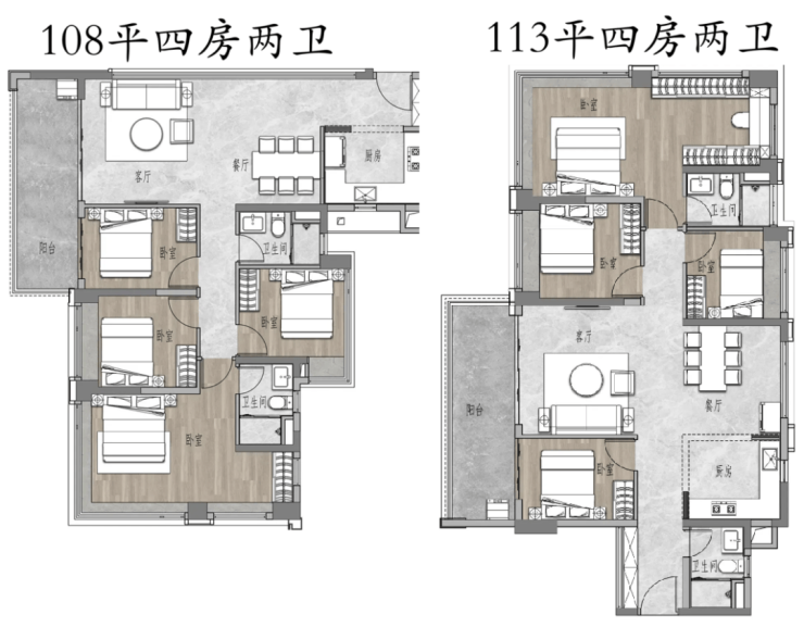 四房设计了108平和113平,其中,113㎡四房两卫,堪称保利珠江天悦的平替,是西部最小的望江四房。四开间朝南,南北对流,南向超大阳台,样板间展现出上一代产品 130㎡的尺度感,LDKB一体化设计,会客空间宽敞。