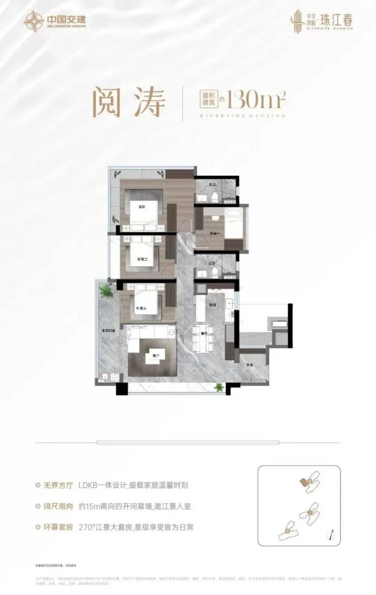 - 130㎡四房两卫:LDKB一体化,约36㎡方厅,实用率超100%