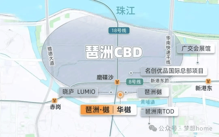 最近的地铁,还是琶洲西区最核心、8/18号线双线交汇的磨碟沙地铁站,仅隔着一条新港东路,直线距离约200米。