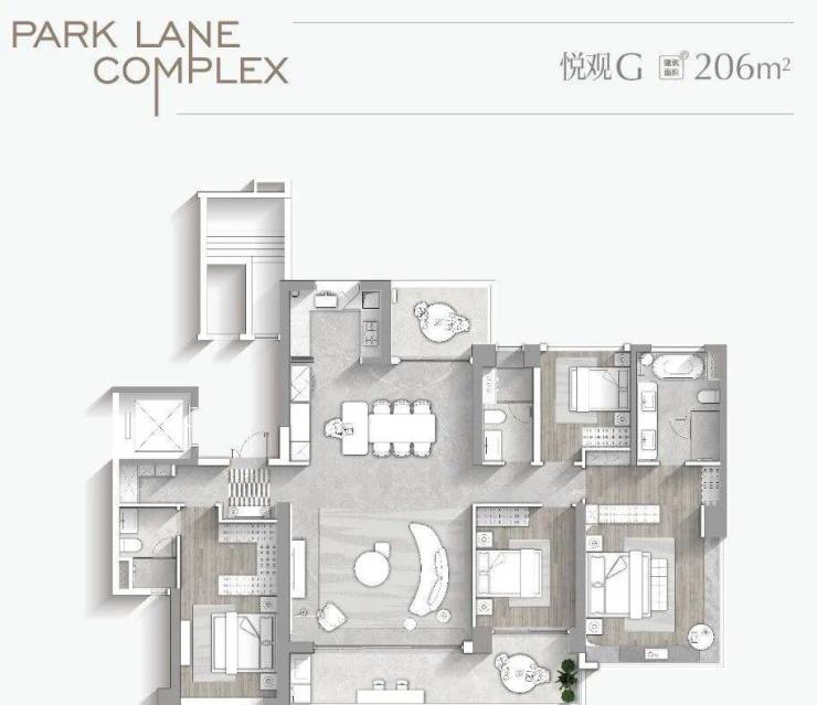 【一期悦观G户型,建筑面积约206㎡】LDKG一体化设计,同享约9.3米南向IMAX观景阳台约40㎡豪华主卧套房,静谧休憩,惬意起居
