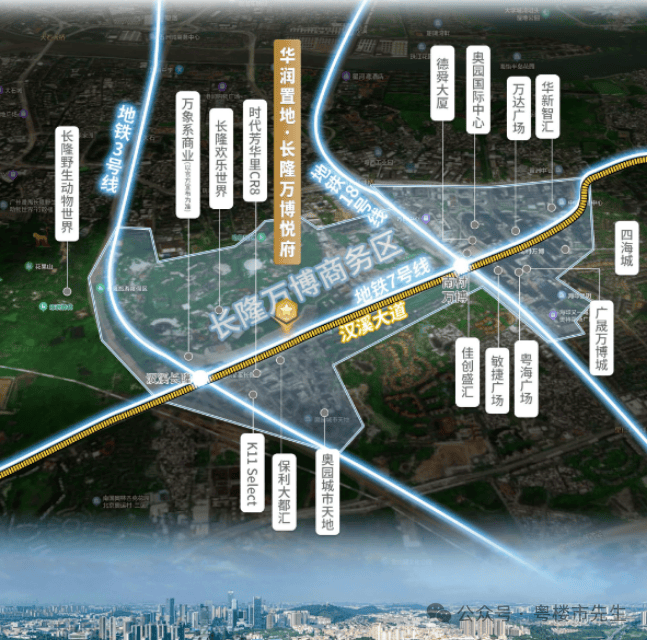 项目位于长隆万博CBD核心,是政府重点打造的“文商旅居产”综合型商圈。板块通过扩容整合长隆度假区(年客流量超4000万)与万博商务区(聚集2.7万家企业,含拼多多、小米等大厂),规模超越珠江新城,目标直指世界级地标商圈。