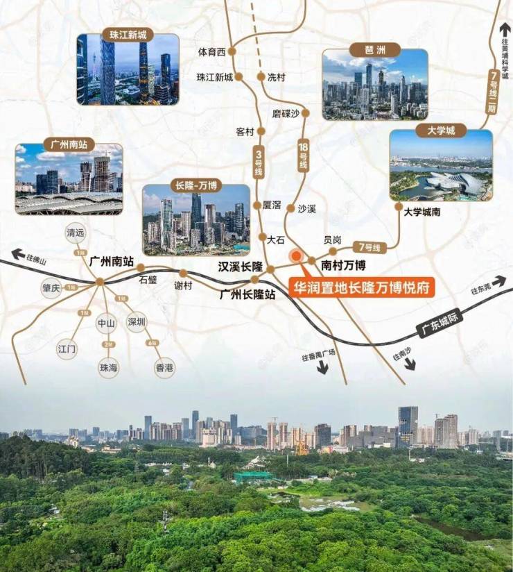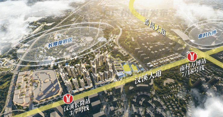 交通配套:三地铁交汇,距3号线、7号线汉溪长隆站约250-500米,步行约8分钟可达;距18号线万博站约1.2公里,二期地下“万象之路”直连地铁。周边还有汉溪大道、番禺大道、南大干线、新光快速等多条主干道,自驾出行便利。