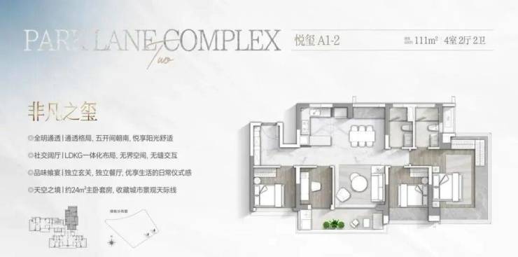 • 一期:123-206㎡四房,主打LDKG一体化设计、6.6米双面阳台、主卧270°采光。