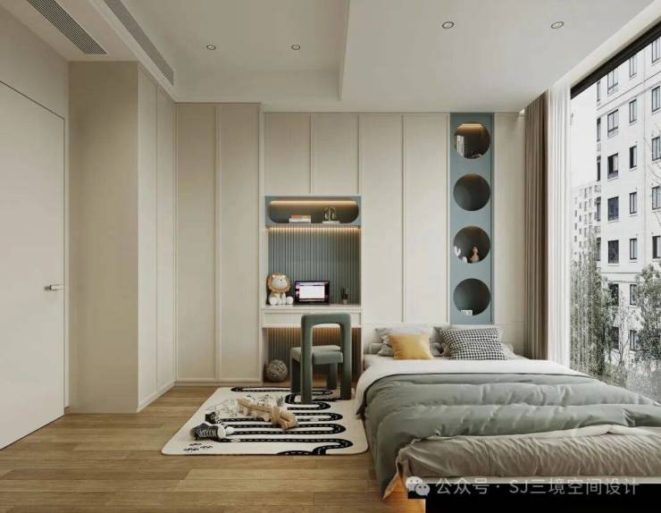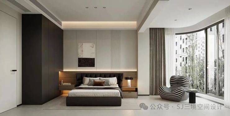 ②采用弯钢玻璃打造弧形造型,最大化引入自然采光与户外景观,柔化空间线条的同时,为卧室注入现代艺术感与通透感。