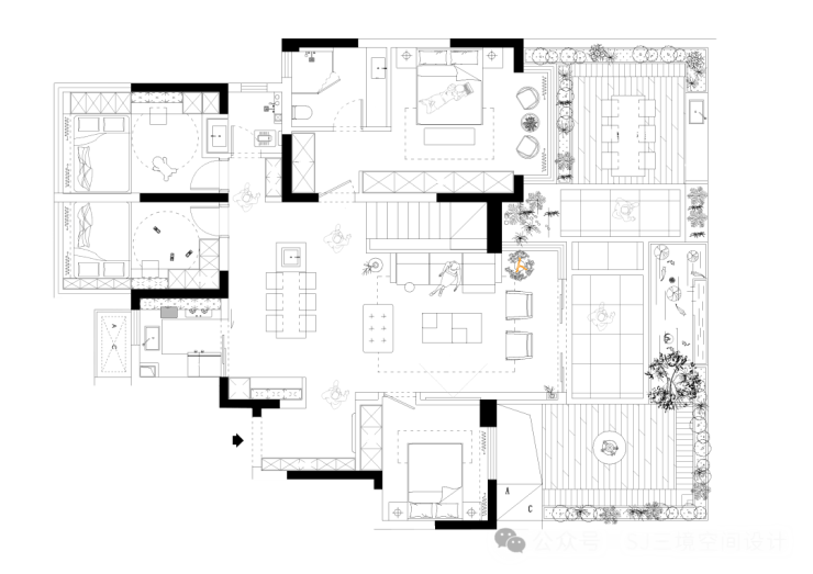 ②侧边用石子围出绿植端景,为空间注入满满的生命力和活力。