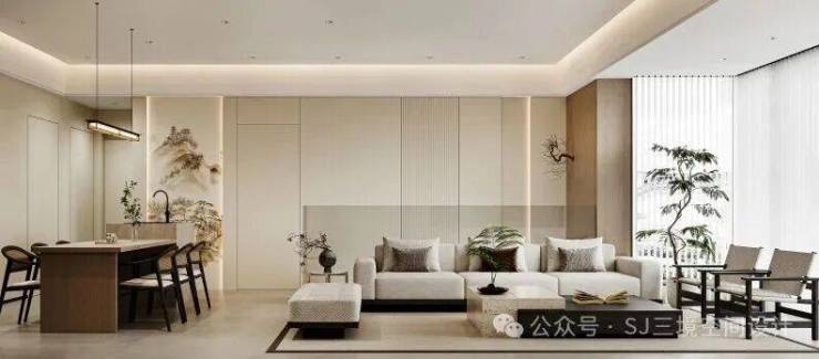 ④采用开放式布局,客厅与餐厅相互渗透,无明显隔断,增强了空间的通透感与整体感,使空间在视觉上更显开阔。