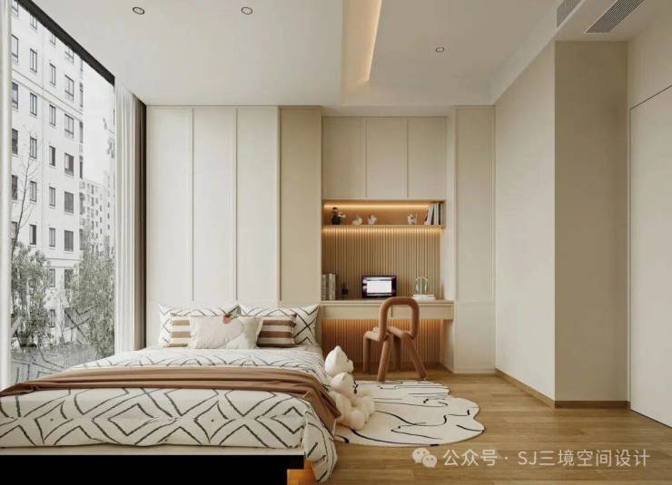 ①木质护墙板结合暗藏灯带,暖光烘托温润氛围,与床品层次搭配,强化空间质感与休憩感。