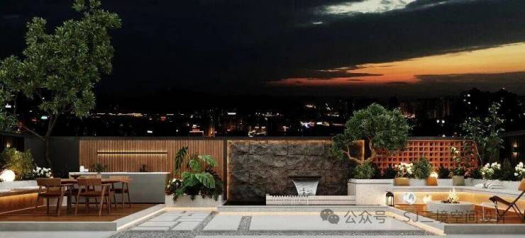 花园通过暖光漫射系统、石质水景墙、围合式木质卡座,构建 “城市秘境” 式户外休闲场域,实现室内外自然景观对话。