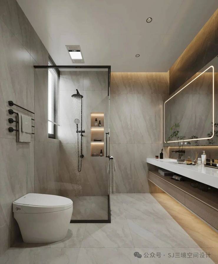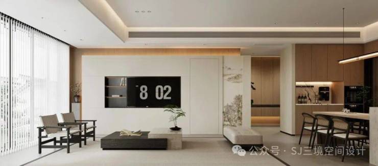 ③悬浮吊顶设计,采用简洁造型搭配线性灯光,强化空间层次感与现代极简质感。