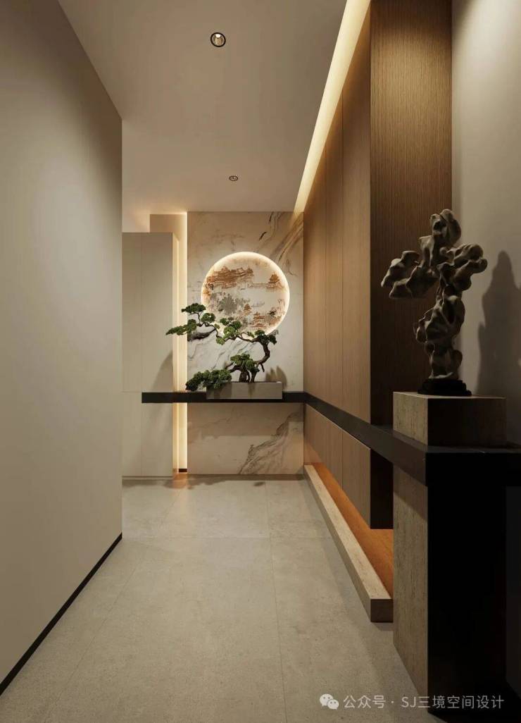 ①以白墙为底色,结合山水画壁布、嵌入灯线,提升颜值。